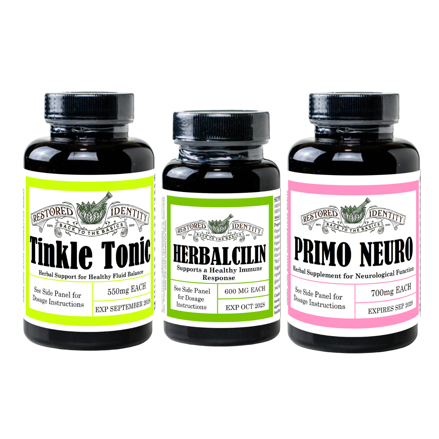 The Restored Identity Nervous System & Urinary Support Kit combines three of our most popular herbal supplements designed to support your immune system, neurological health, and urinary tract wellness.*